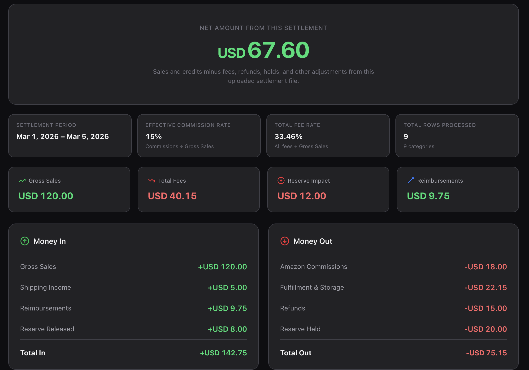 Upload a settlement file and get a clear, line-by-line breakdown of every fee, refund, and reimbursement. Mapped when known. Flagged when unclear.